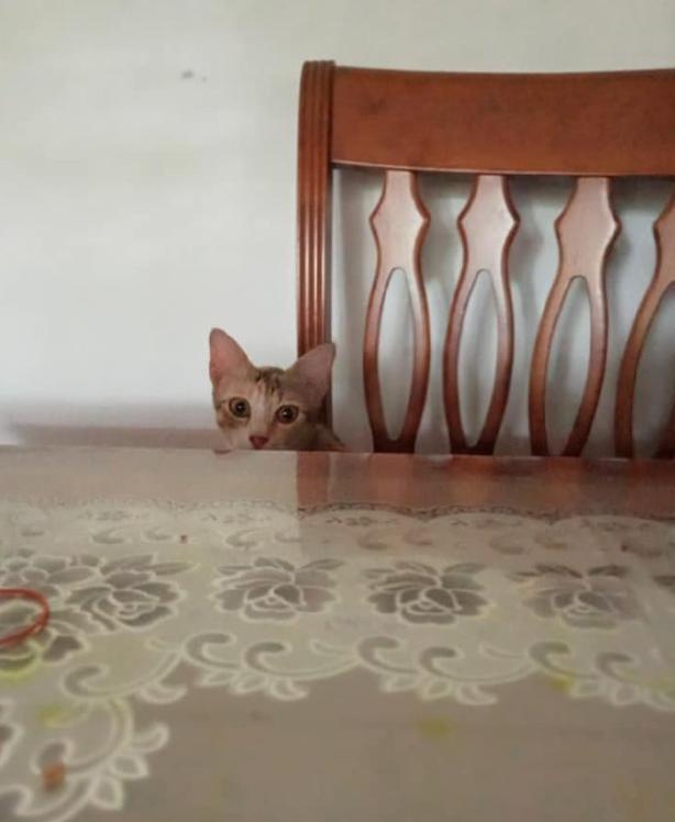 一只猫咪听到铲屎官吃东西的声音,默默地来到餐桌旁边观察。