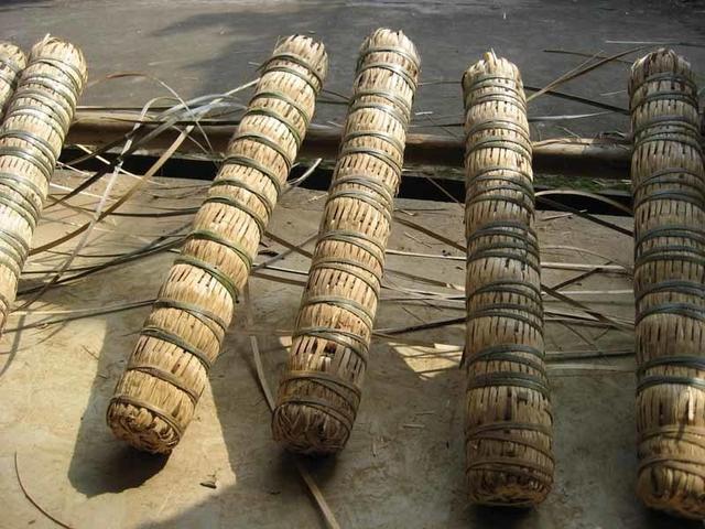 将蒸透的茶叶装入衬竹箴的模具中紧压形成似柱子的形状。