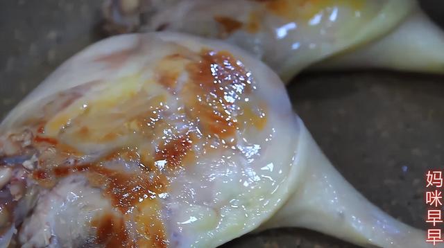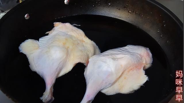 2,控干水份的鸭腿放入平底锅里面煎一下,因为鸭肉油脂比较多,把肥油煎出来,鸭肉吃着才不会腻,一直煎到鸭腿表面金黄就可以了。