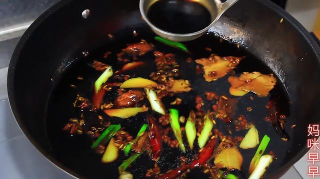 3、鸭肉放入砂锅,加姜片、干红椒、再放入适量的热卤汁,这个卤肉卤菜都很好吃。酱料和水的比例是1:1,大火煮开转中火焖30分钟。