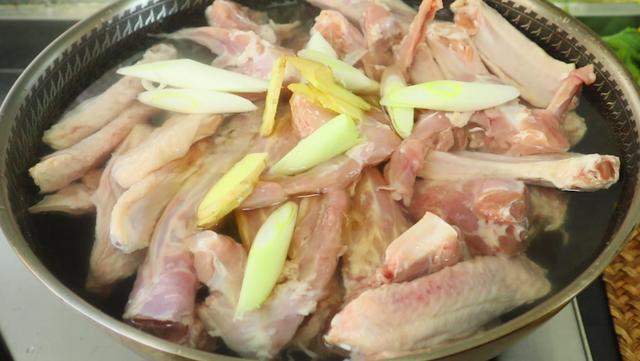 2、处理干净的鸭脖、鸭架、鸭翅冷水下锅,,加入葱姜、料酒去腥,大火煮开后打掉浮沫,继续煮2分钟,捞出来再冲洗干净。