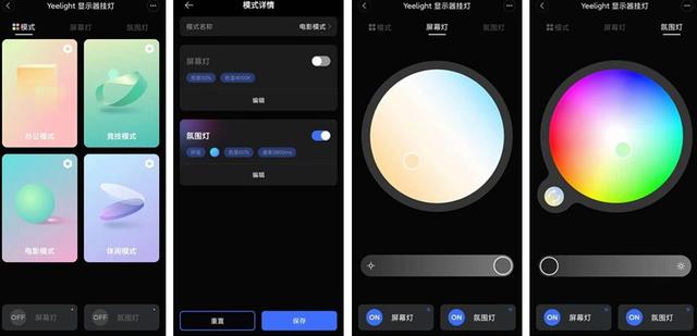 米家APP中可以更细致的设置屏幕等的玩法。通过旋钮开关或者APP可以在办公模式、竞技模式、电影模式和休闲模式中切换,模式可以进行删减和针对各自使用习惯进行个性化的调整。屏幕灯和氛围灯可以分别进行开关控制,同时亮度、色温和色彩都可以在APP中直观的调整。此外APP中还可以进行灯光编组(如果家里有其他匹配的智能灯组)、延时设定、旋钮设置、智能场景等实用设定。