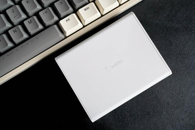 贝尔金108W充电器整个产品的体积比较小巧,得益于采用了GaN氮化镓工艺,充电器在得以保持较小体积的同时依旧拥有出色的散热表现和快充能力。针对桌面使用采用了桌面式分体设计,插头占用空间小完全不占其他插口空间,同时也不会因为充电头过重造成使用过程下垂。产品的底部配置有专用的防滑垫脚,分离式电源线设计走线使用更加方便。