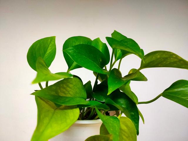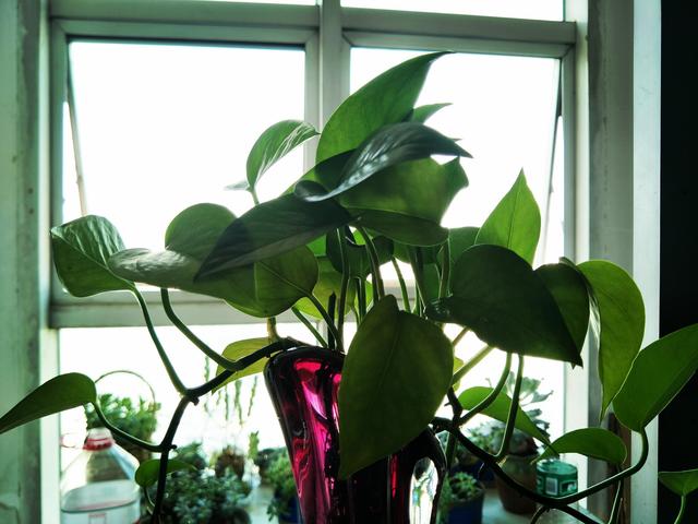 如下图,红袖无意间看到的绿萝,为主人点赞,能把绿萝养这么好,不光水分充足,看枝条的结实程度,光照环境也也不会差。