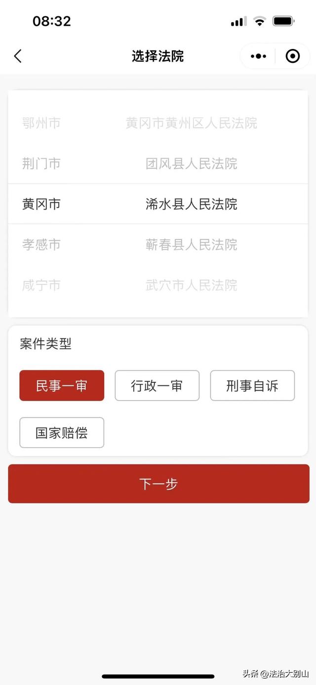 5、滑动选择所属法院,然后选择对应的案件类型。