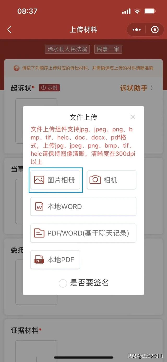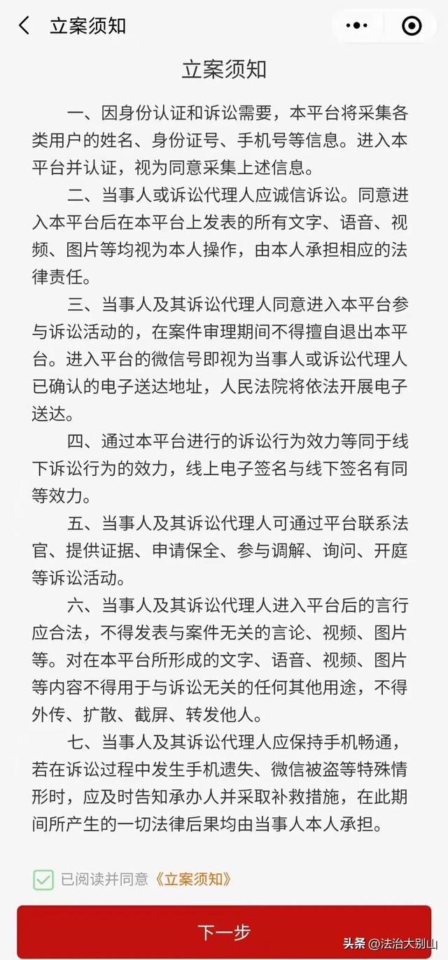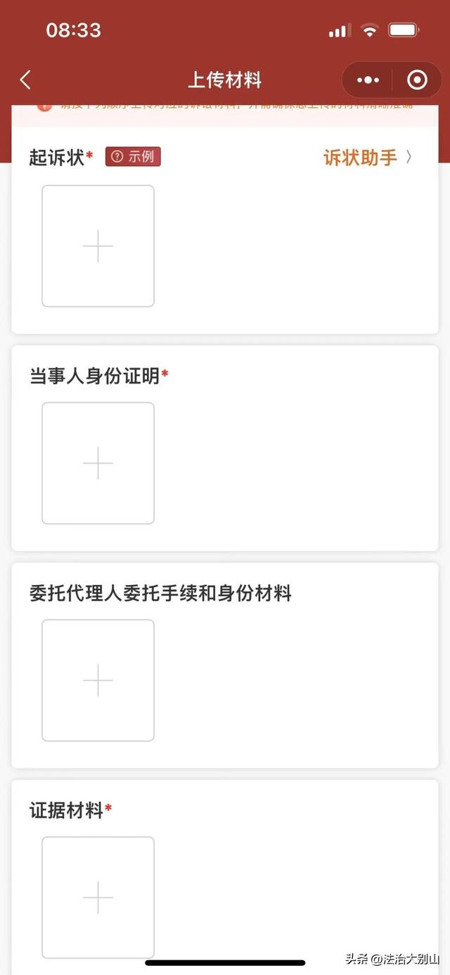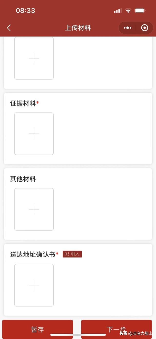 7、上传对应的起诉状、身份证明、证据材料及送达地址确认书,完成后点击“下一步”(建议先用手机相机拍照后再依次上传)。