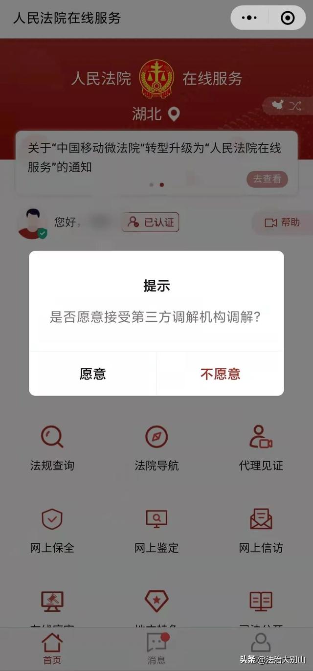 3、弹出“是否愿意接受第三方调解机构调解”按钮,点击“不愿意”。