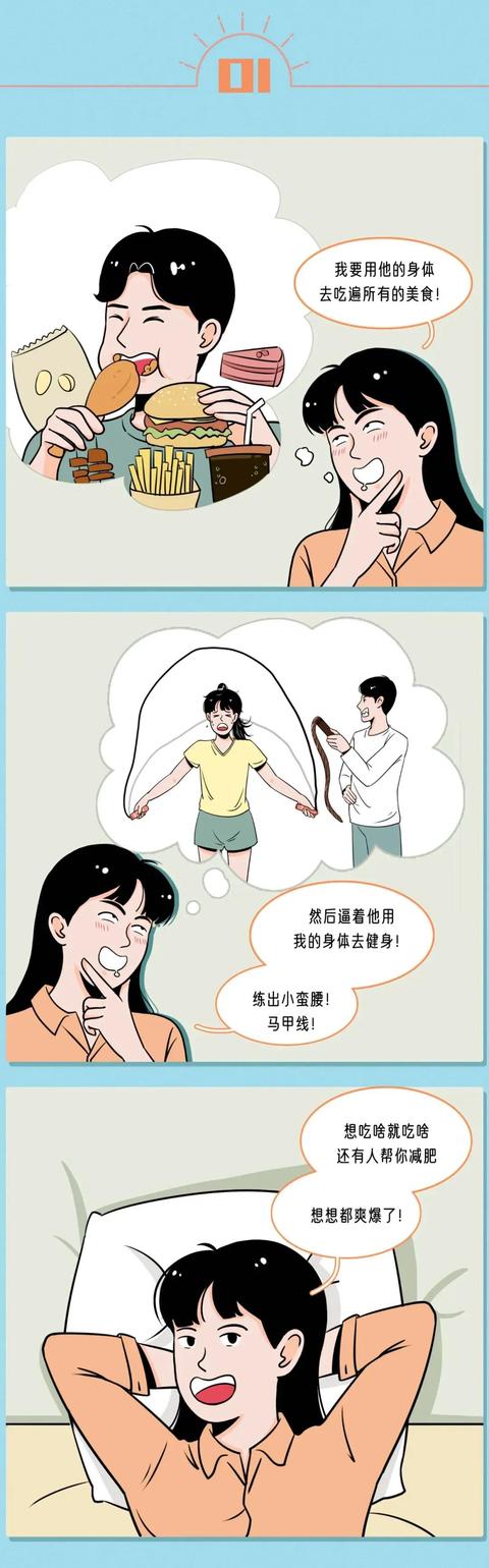 比如思维方面男性偏理性,女人偏感性,那么如果让你进入男朋友的体内,你会有什么大胆的思想?比如把他的身材变成你想要的身材,拼命的健身。一组漫画带你详细了解一下。