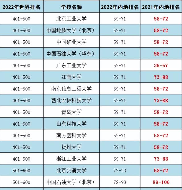 郑州大学、南京医科大学、华东师范大学首次跻身于全球前300强。上海科技大学、暨南大学首次跻身于全球前400强。江南大学、西北农林科技大学、江苏大学、浙江工业大学首次入围全球前500强。