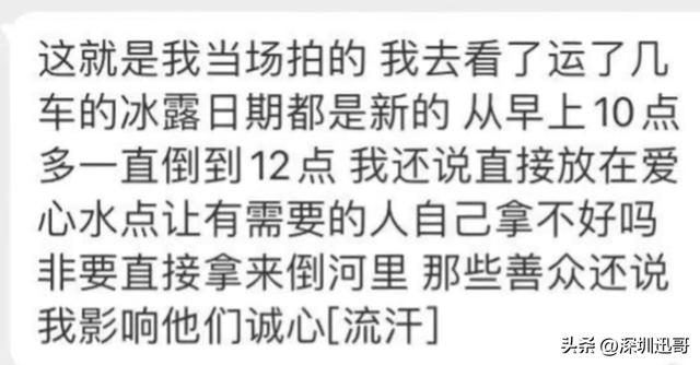而视频里的情况就完全不一样了,从上午10点多倒到12点多,运了好几车的矿泉水,网友上去看了,水的日期都很新,提醒他们放在爱心水点让有需要的人拿,也挺好,被怼影响到他们的诚心。