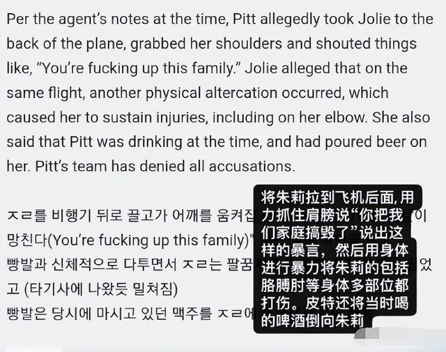 15岁的继子试图维护自己的母亲,但也遭到了布拉德皮特的殴打,据报导得知布拉德皮特抓住了安吉丽娜的肩膀并且说出“你把我们的家庭搞毁”了的惊人言论,之后就开始对妻子进行暴力攻击,以至于安吉丽娜朱莉身体多个部位都受到了创伤。