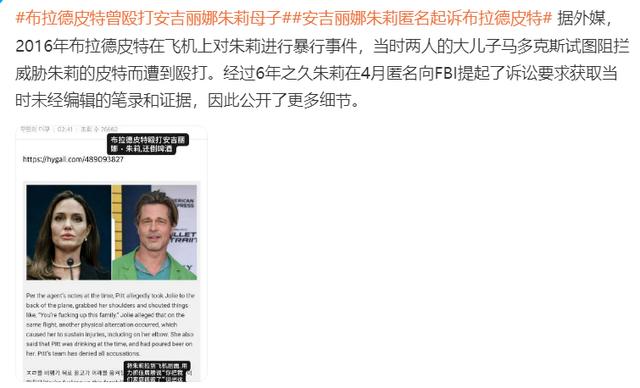 近日,有媒体爆料安吉丽娜朱莉匿名起诉前夫布拉德皮特,罪名为2016年时他曾在飞机上对妻儿两人进行家暴。