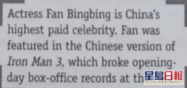 近日近有网民发现范冰冰出现在西班牙教科书,更被评为「中国最高薪名人」。 其实范冰冰出事前曾蝉联「福布斯中国名人榜」第一名,又多次出席法国康城电影节、美国Met Gala等国际盛事,多年来都是中国影视圈重要人物之一。