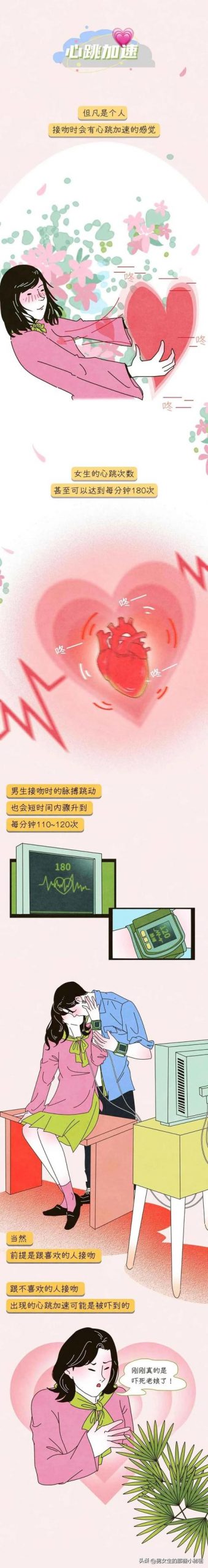 女生刚开始接吻的时候,心跳次数可以达到每分钟180次,男生也会有相应的感觉,在接吻的时候脉搏的跳动次数也会短时间骤升到每分钟110~120次。