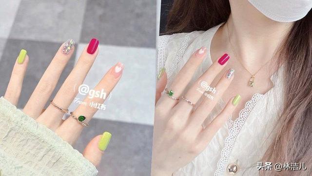 来了来了,喜欢缤纷跳色的女孩绝不能错过这款夏日美甲,三种跳色加上闪亮亮的亮片,非常可爱。尤其是带点荧光绿的美甲,根本就是夏天的标配,加上莓果红和白色显白又清新,如果还能搭配相同元素的戒指和首饰的话,也会更加分。