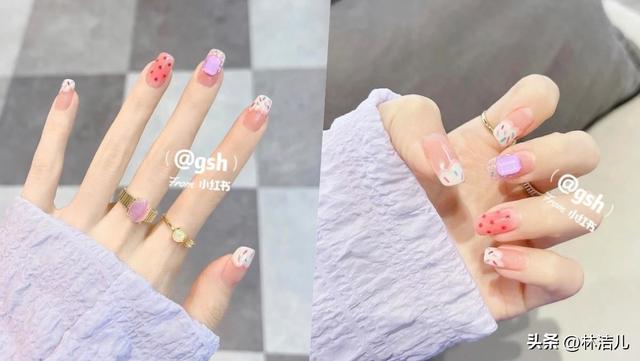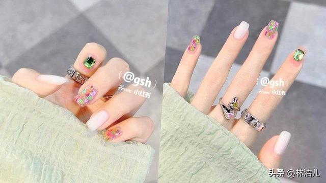 这款缤纷的粉绿色亮片搭配,非常百搭。加上冰透感白色是不是很有夏日氛围?为了不单调再特别配上一个绿色方钻,高级感直线上升!这款可以说任何女孩子都适合,赶快趁着暑假当个夏日精致Girl吧!