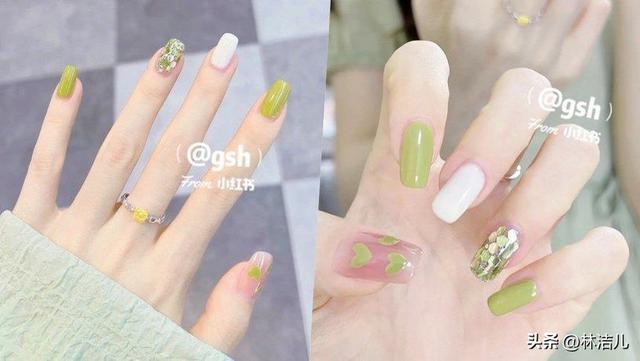 糖果嫩绿色一看就很有夏日气息,简约的单色配上纯色亮片,看起来超闪超高级,这种颜色十分显白,再加上乳白色的跳色,显得更有层次不无聊,还有亮眼的细致亮片做点缀,清爽的两色搭配,不费力就超有时尚感的一款。