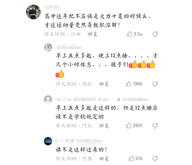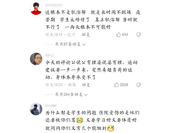 更有网友义愤填膺,说现在的学生这点运动量都承受不住,就是平时太懒,太娇生惯养了。现在这个样子,以后也会让学校在安排运动的时候,受到阻碍。