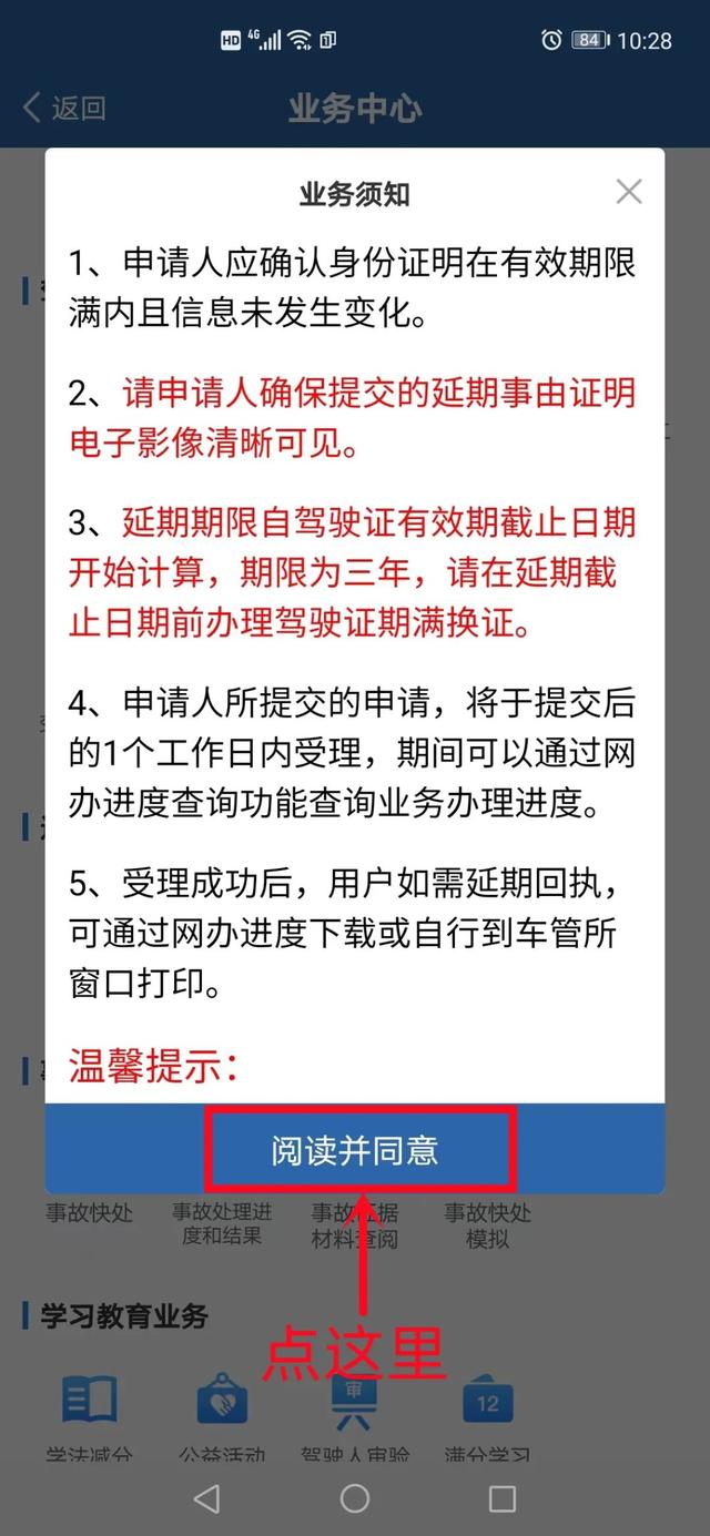 第二步:认真阅读期满换证业务须知后,可以点击【阅读并同意】。
