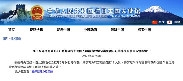 8月22日,中国驻日本大使馆网站发布消息称,根据有关安排,自北京时间2022年8月24日零时起,持有效APEC商务旅行卡人员、持有效学习居留许可的外国留学生无需重新办理赴华签证,可持上述证件入境。