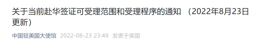 8月23日晚,中国驻美国大使馆发布关于当前赴华签证可受理范围和受理程序的通知 (2022年8月23日更新)称,自北京时间2022年8月24日0时起,持有效学习类居留许可的外国留学生及持有效APEC商务旅行卡人员可入境中国。