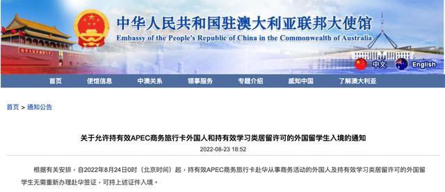 8月23日,中国驻澳大利亚大使馆网站发布消息称,根据有关安排,自2022年8月24日0时(北京时间)起,持有效APEC商务旅行卡赴华从事商务活动的外国人及持有效学习类居留许可的外国留学生无需重新办理赴华签证,可持上述证件入境。