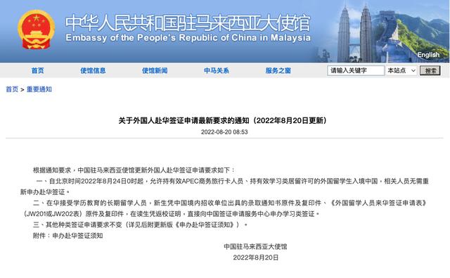 8月20日,中国驻马来西亚大使馆网站发布消息称,根据通知要求,中国驻马来西亚使馆更新外国人赴华签证申请要求如下: