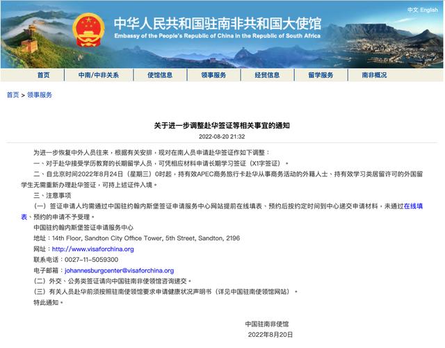 8月20日,中国驻南非大使馆网站发布消息称,为进一步恢复中外人员往来,根据有关安排,现对在南人员申请赴华签证作如下调整: