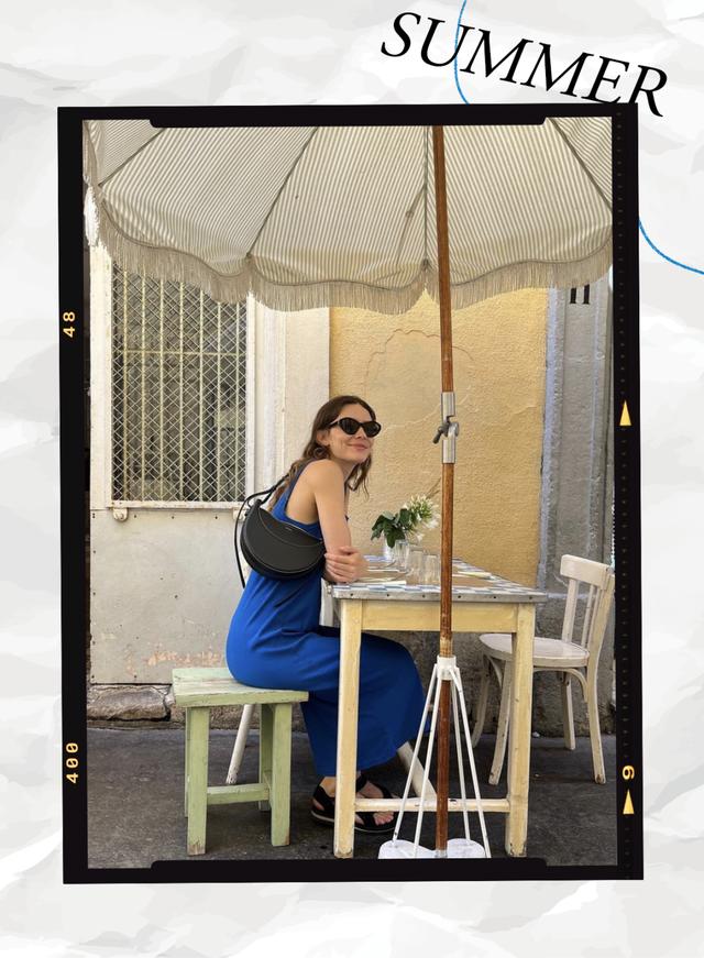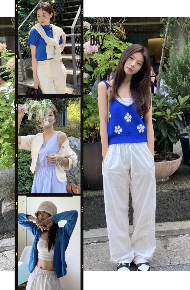 在夏末最实用的就是蓝色外搭+白色吊带,属于是防晒美丽两不误了。