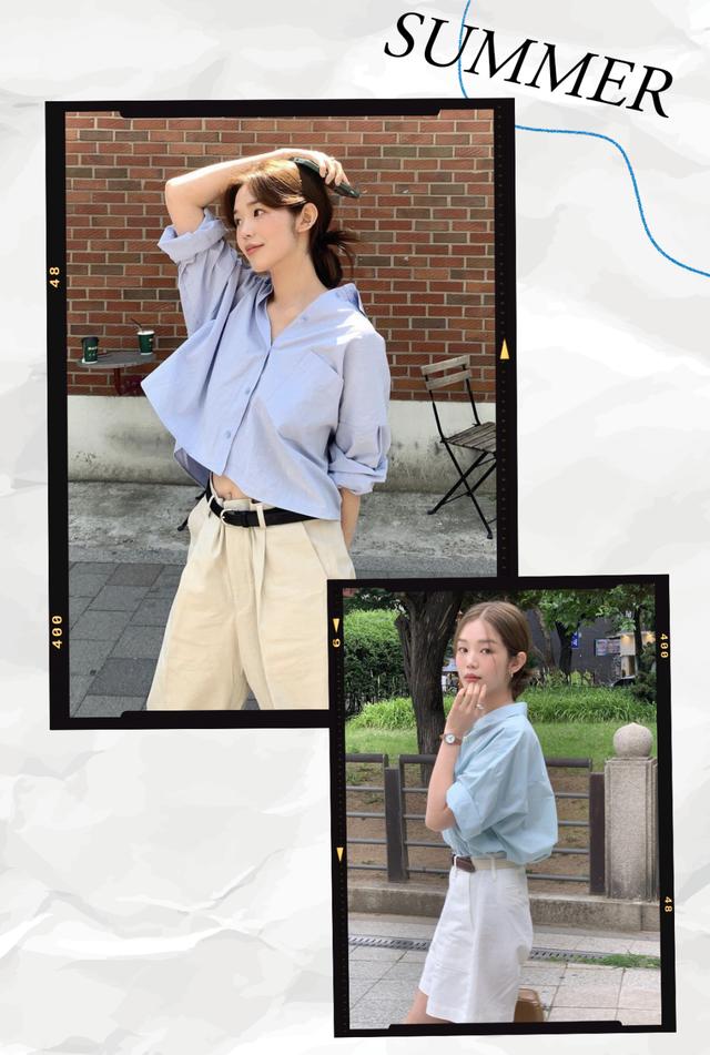 基础的一件蓝色衬衫+白色西裤就完美适配各位都市丽人,简洁大方又随性。