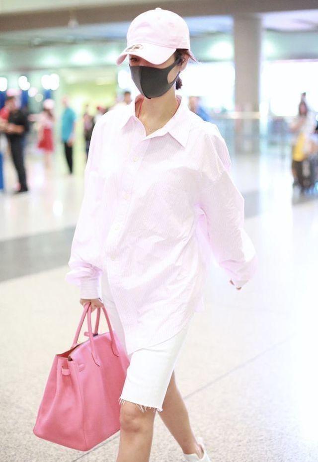 宽松衬衫搭配紧身骑行裤呈现流畅清晰使林心如看上去纤瘦高挑,同时普通的衬衫特殊的穿法瞬间提升时尚感,将衣摆不规则的扎进下装中削减宽松感,同时卷起衣袖视觉上有种泡泡袖的既视感,增加肩膀宽度对于骨架较大或者有麒麟臂的女性也很合适,上半身的休闲感与骑行裤的运动感融合展现了青春活力与朝气,让已经年过40的林心如看上去像少女,而且利用粉色修饰气色又不显装嫩,整体穿搭休闲舒适丝毫不显舒服与累赘。