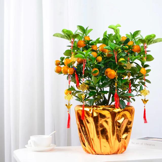 “桔”与“吉”谐音,桔树寓意着大吉大利,富贵吉祥。而且金桔成熟后是好看的金黄色,看着就很喜庆。每年过年的时候,花市里挂满果子的金桔树是一种很受欢迎的年宵花。买回家后,再在上面挂上红色的小灯笼,更是让人觉得喜庆吉利。