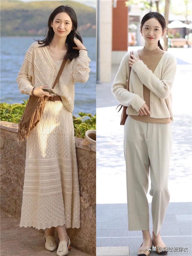 关于杏色单品想要穿得好看,要找准它的风格,由于杏色本身的色彩给人的感觉比较柔和,所以我们在搭配的时候最好就选择这种温柔风,淑女风的穿搭,这样去搭配的话会觉得协调很多,像这种温柔的针织衫,温柔的杏色长裙其实都有利于展现女人味,颜色和服装的款式风格完全一致,也会觉得更协调。
