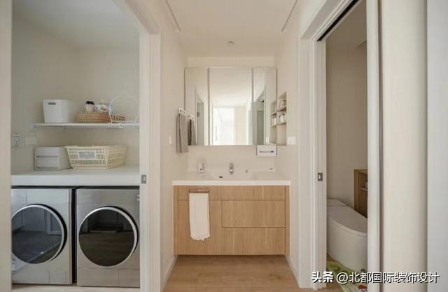 台盆下方柜体和上方镜柜可以收纳洗漱用品。马桶上方设计一个收纳柜,收纳卫生用品。淋浴区可以设计壁龛收纳沐浴用品。洗衣区定制通顶高柜,下方嵌入洗衣机、烘干机,上方柜体做收纳。