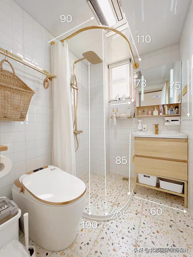 马桶宽度控制在75~90cm之间,台盆标准宽度控制在60~120cm之间,淋浴区的标准宽度是90cm。
