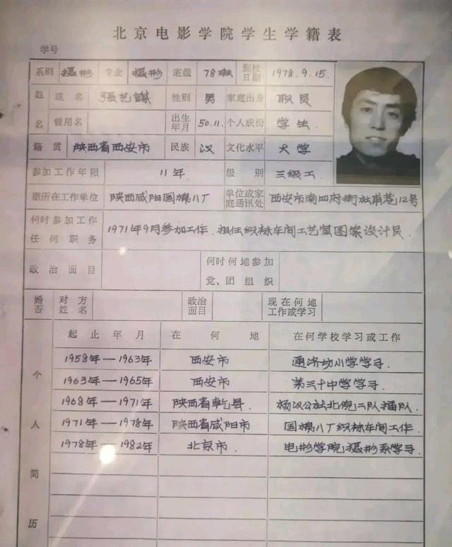 我们首先看他的名字,当时他在书写他名字的时候,“艺”字不用繁体字,而“谋”则是繁体字,不像现在签名,三个字都是繁体字。资料中显示张艺谋在1958年到1968年都在读书,1968年到1978年在工作,可以看出他是刚恢复高考的时候才考上的北京电影学院。