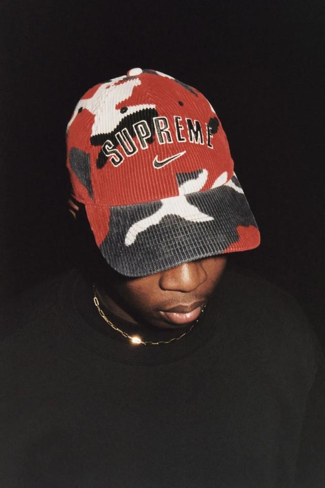 最后就是三款鸭舌帽,灯芯绒材质打造,在正面设计有 Supreme 与 Nike Logo,彰显联名身份。