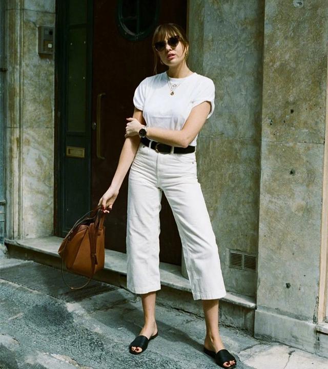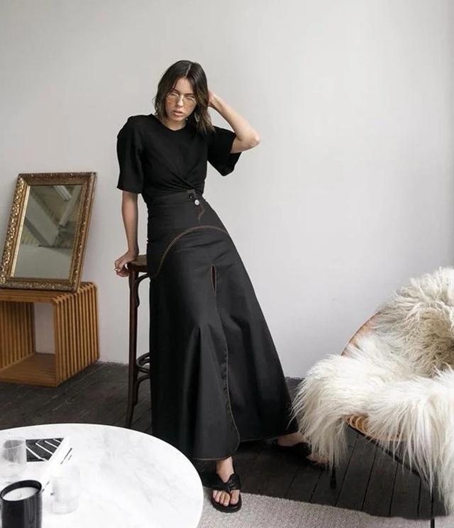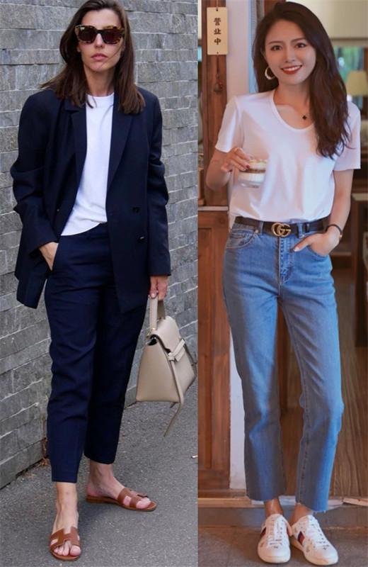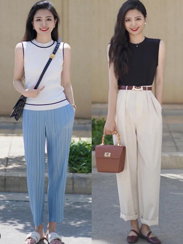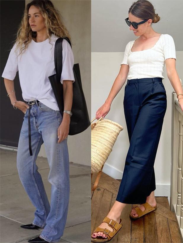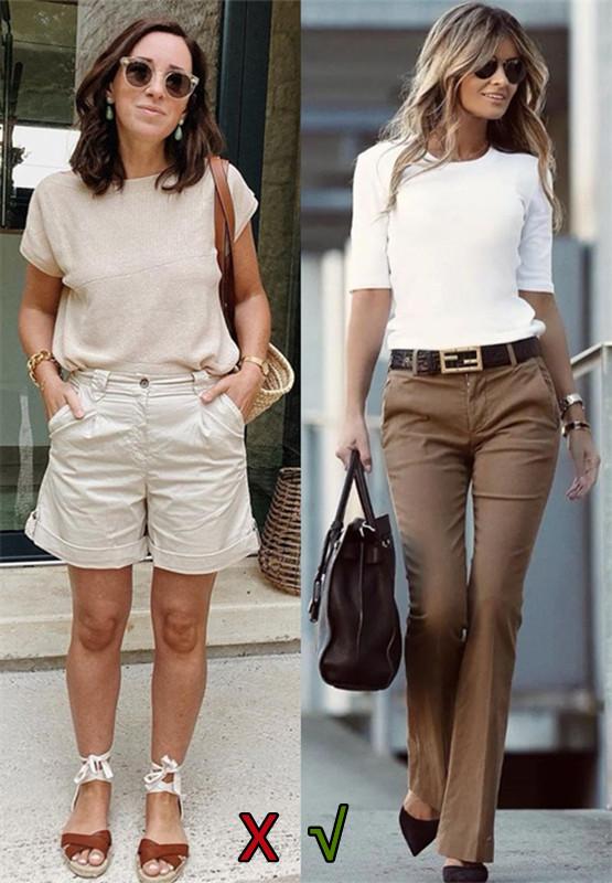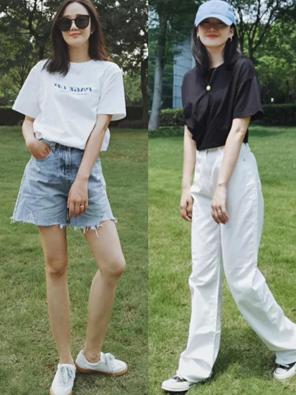 浅色清爽大方,自带减龄气息,在夏日的使用率居高不下。但正是颜色清浅,使得它具备一定的视觉膨胀感。当两件T恤是同样版型的版型,建议身材微胖、腰腹部有赘肉的40岁女人选择深色。因为深色神秘深邃,在视觉上能起到收缩的既视感,整个人看上去会更加的秀气显瘦。