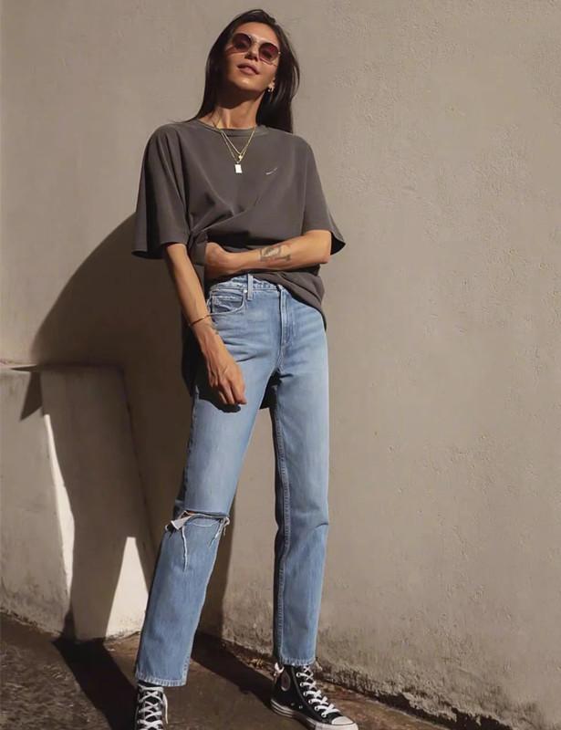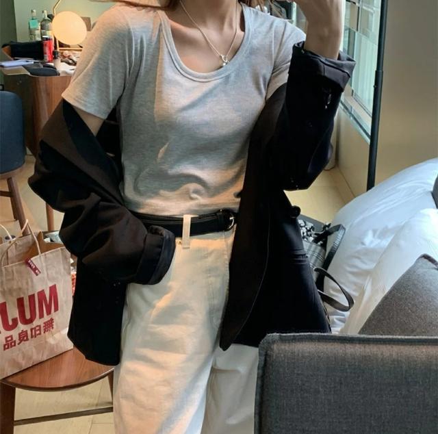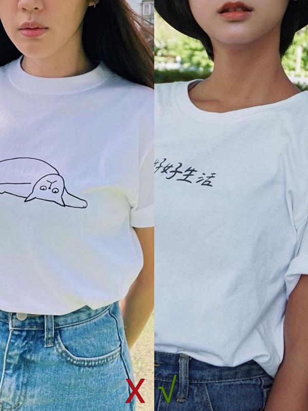 T恤的领口大小,也是选款需要注意的关键点。对于脖颈粗、短的女人来说,建议领口位置不高于锁骨起始点,增加视觉延长感,整体的比例看上去会更加协调、更加有透气性。而脖颈细、长的女性,天生自带优势,可以任意选择领口大小。