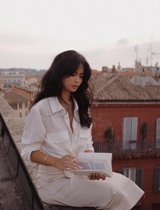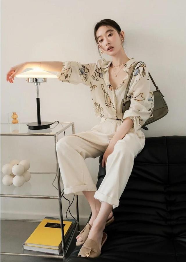 上图这件衬衫,整体是米色基调,出场就伴随着高级和优雅,服装表面上点缀了一些抽象的印花,将穿着者的肤色衬托得明亮又白皙,这些犹如从复古油画中剥离出的花色,淡雅静谧、清淡柔和,轻而易举地展现出一种诗意,将女性柔软之美悄然氤氲而出。