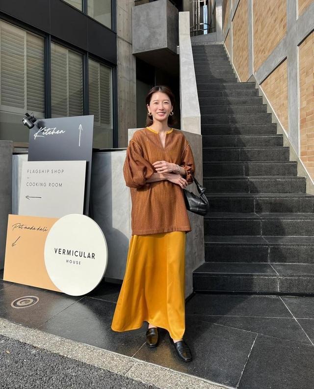 比如这条半裙,犹如托斯卡纳艳阳的橘黄色附着在轻薄如烟的醋酸面料上,谱写着浪漫优雅的秋日赞歌,上衣选择简单的大地棕色衬衫,革除亮橘色对肤色的影响,演绎出青春活泼又不失文艺的女性气质。