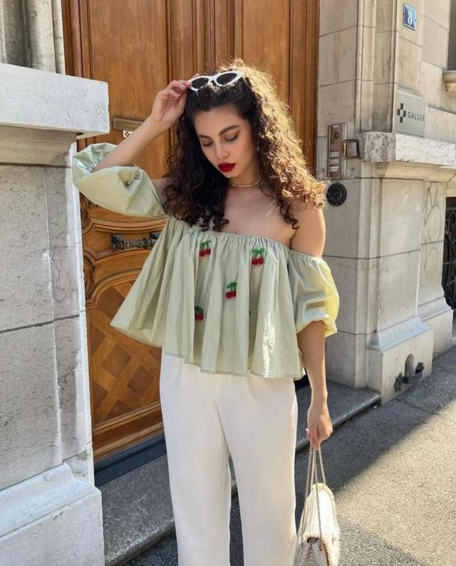 豆沙绿在穿着时,为了让显白的效果达到最大化,可以借助露肤的方式,让肤色在面部和绿色衣服之间形成缓冲,这样整体就不会显得十分突兀了。