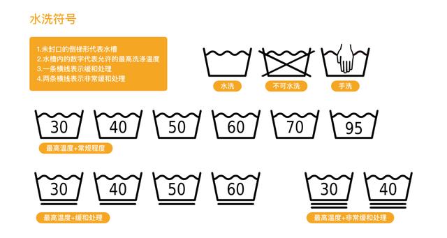 基本的符号包括:可水洗、不可水洗和手洗。标有数字代表接受水洗的最高温度,对应洗衣机加热洗的功能。有些水洗标志下方一条横线,代表缓和处理,两条横线代表非常缓和处理,对应着设置洗衣机清洗方式时需要选择「轻柔」或跳过甩干程序。