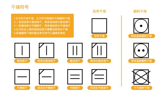 分为自然干燥、翻转干燥两种,正方形和中间的竖线组合表示自然干燥就是自然风干,正方形和中间的圆形组合在一起表示可以机器翻转干燥。自然干燥是其实就是咱们日常的晾晒,然后各种操作方式也是让人眼花缭乱,晾晒环境不同,分为正常晾干、阴凉处阴干,阴干的标识是左上角的小斜杠;晾晒方式的不同分为悬挂、平摊,这个通过线是躺着还是立着就能直观看到;至于衣物是从什么状态晾干也有讲究,一根线表示水分较少的晾干,两根线则表示湿漉漉的滴干,注意需要滴干的衣物是不能进行脱水处理的。翻转干燥根据圆形中的黑点判断干燥的温度,一个点是低温,两个点是常温,对应着烘干机上不同的温度档位。