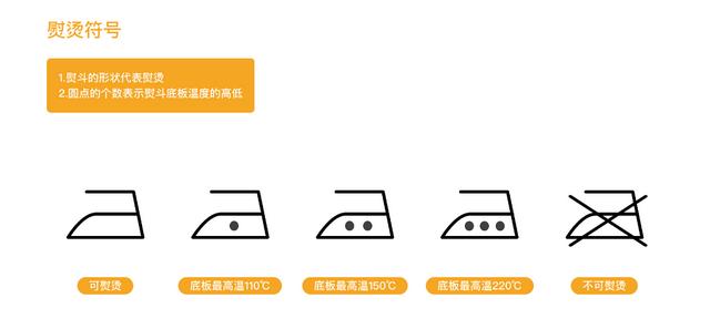 熨烫的分类区别在于熨斗温度,熨烫的标志代表着衣物可耐受的最高温度:一个点表示110度,两个点表示150度,三个点表示220度。除了符号之外,熨烫标识旁还会附有文字说明,反面熨烫、湿熨烫、垫衬布熨烫之类。
