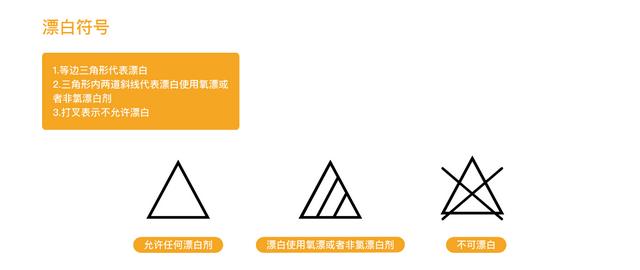 单独一个三角形代表可以使用任何漂白剂,三角形内两道斜线表示需要使用氧漂或者非氯漂白剂,打叉就是别漂白的意思。