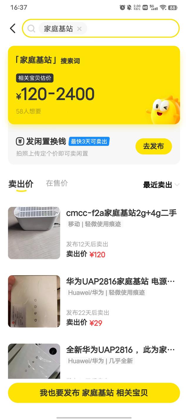 至于购买家庭基站,倒是不难,只是无法从正规电商平台买,闲鱼之类的二手平台家庭基站非常多,只是基本都是4G网络,想来是5G网络普及不久,家庭基站商用数量不多,要向运营商申请才能买到。