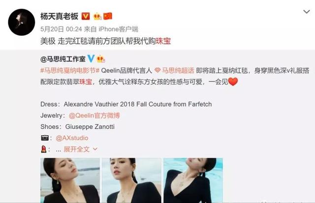 而别人戴珠宝需要借,杨天真却是真金白银的买,也正因此,品牌方才最爱把珠宝借给壹心的艺人,因为明星前脚走下红毯,杨天真后脚就安排代购。