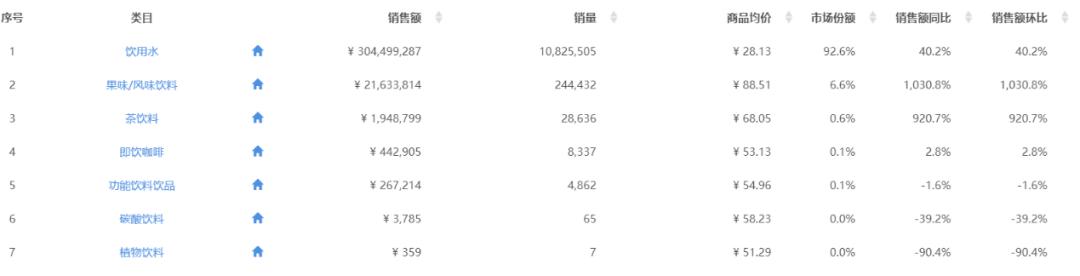 2021年淘宝天猫平台怡宝饮料市场各子类目销售情况