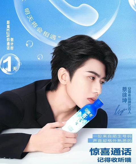值得一提的是,安慕希在产品营销上主打明星营销,增进与年轻群体的沟通。通过庞大的粉丝群体进行热度发酵,提升产品在社交平台的传播力,在粉丝经济下,流量带飞销量。在代言人蔡徐坤生日当天安慕希发布短片,提及“年轻汽盛”、“一汽畅快”,通过蔡徐坤视角传达新品内容,突出气泡元素。在七夕,安慕希还打出了解锁蔡徐坤独家语音、限定声音海报等玩法,与粉丝群体积极互动,提高新品曝光,使“有汽儿”更深层触及消费者。